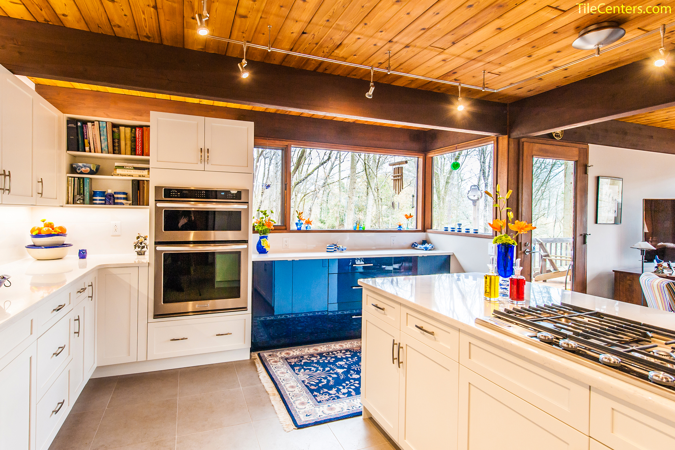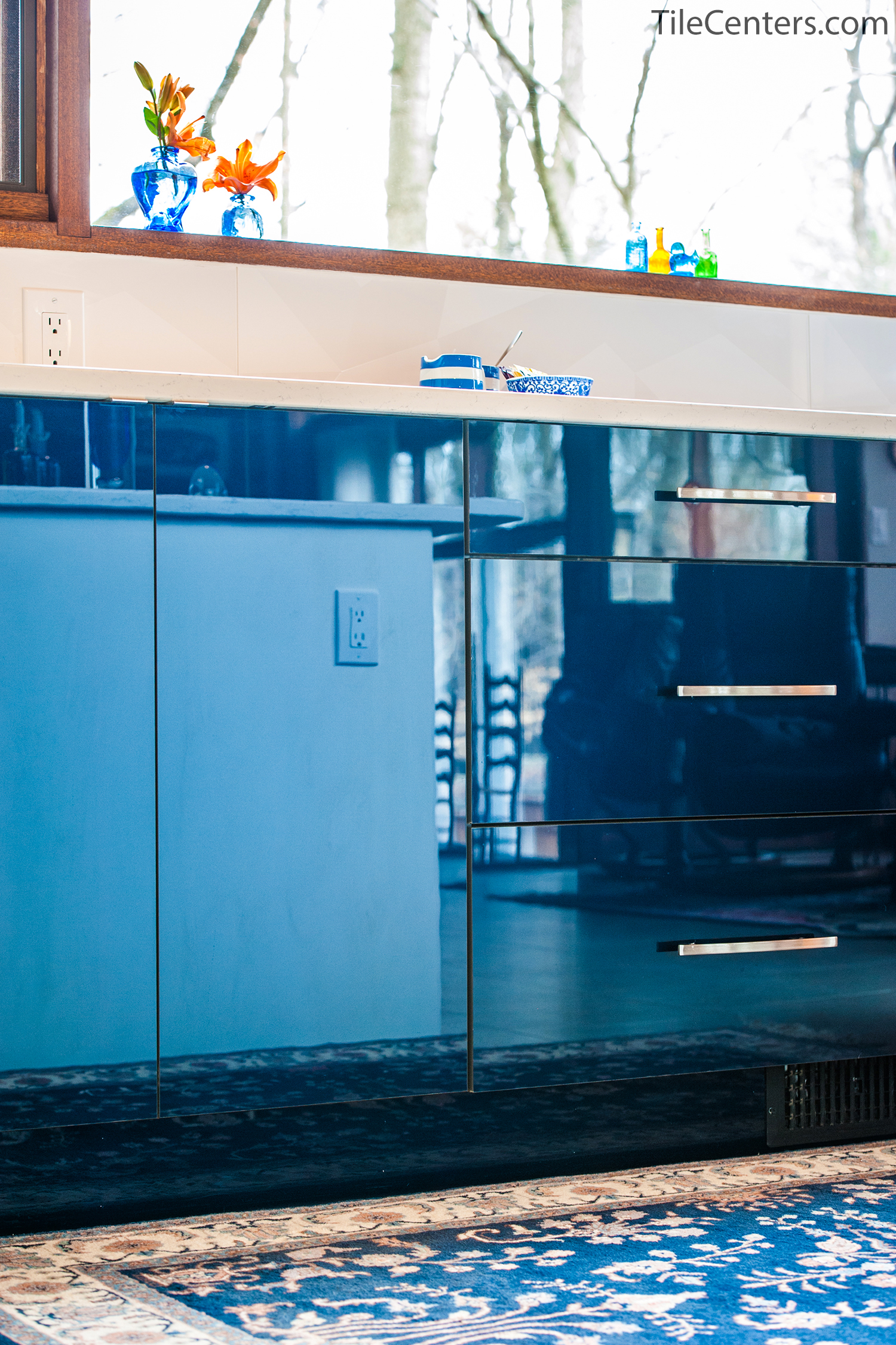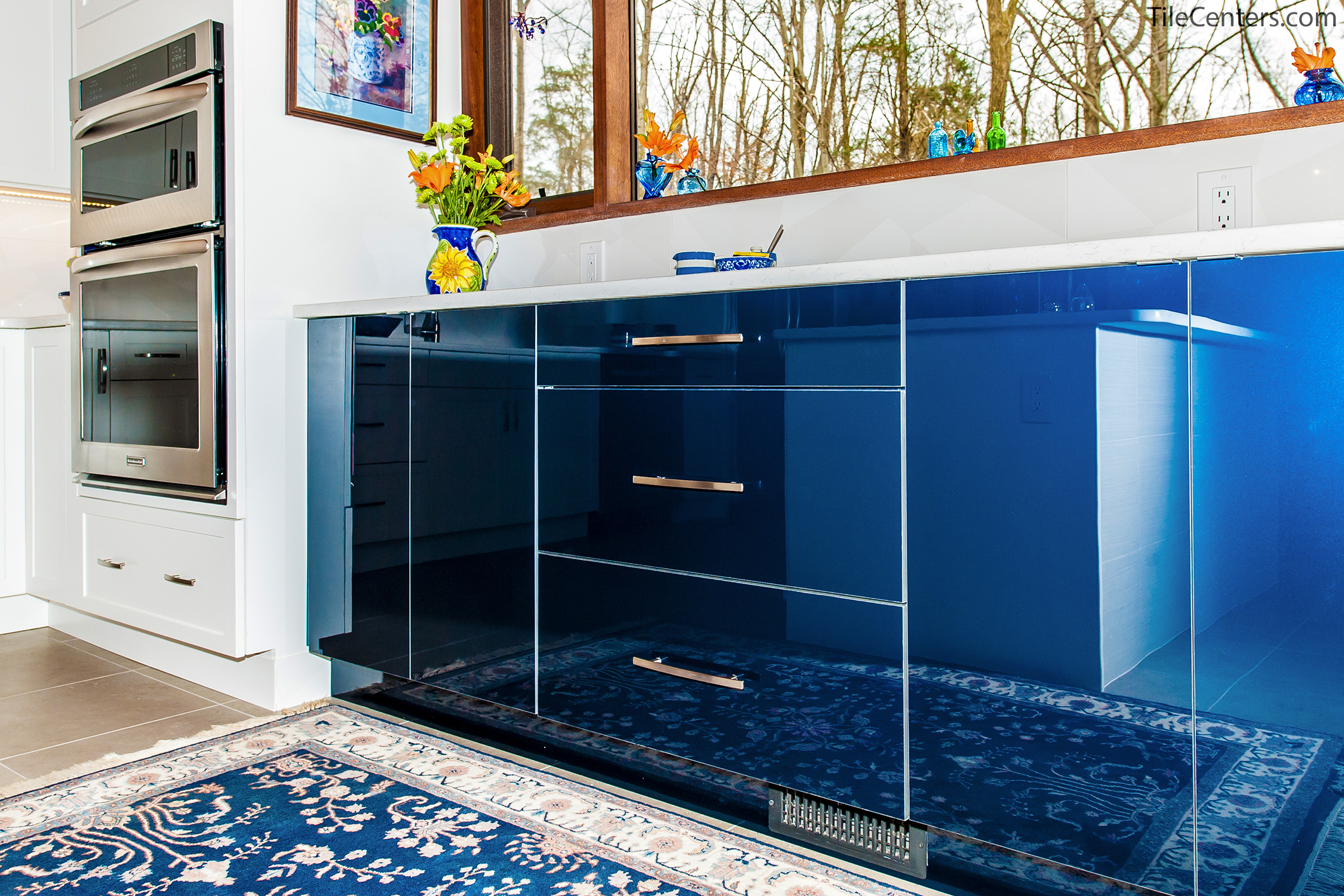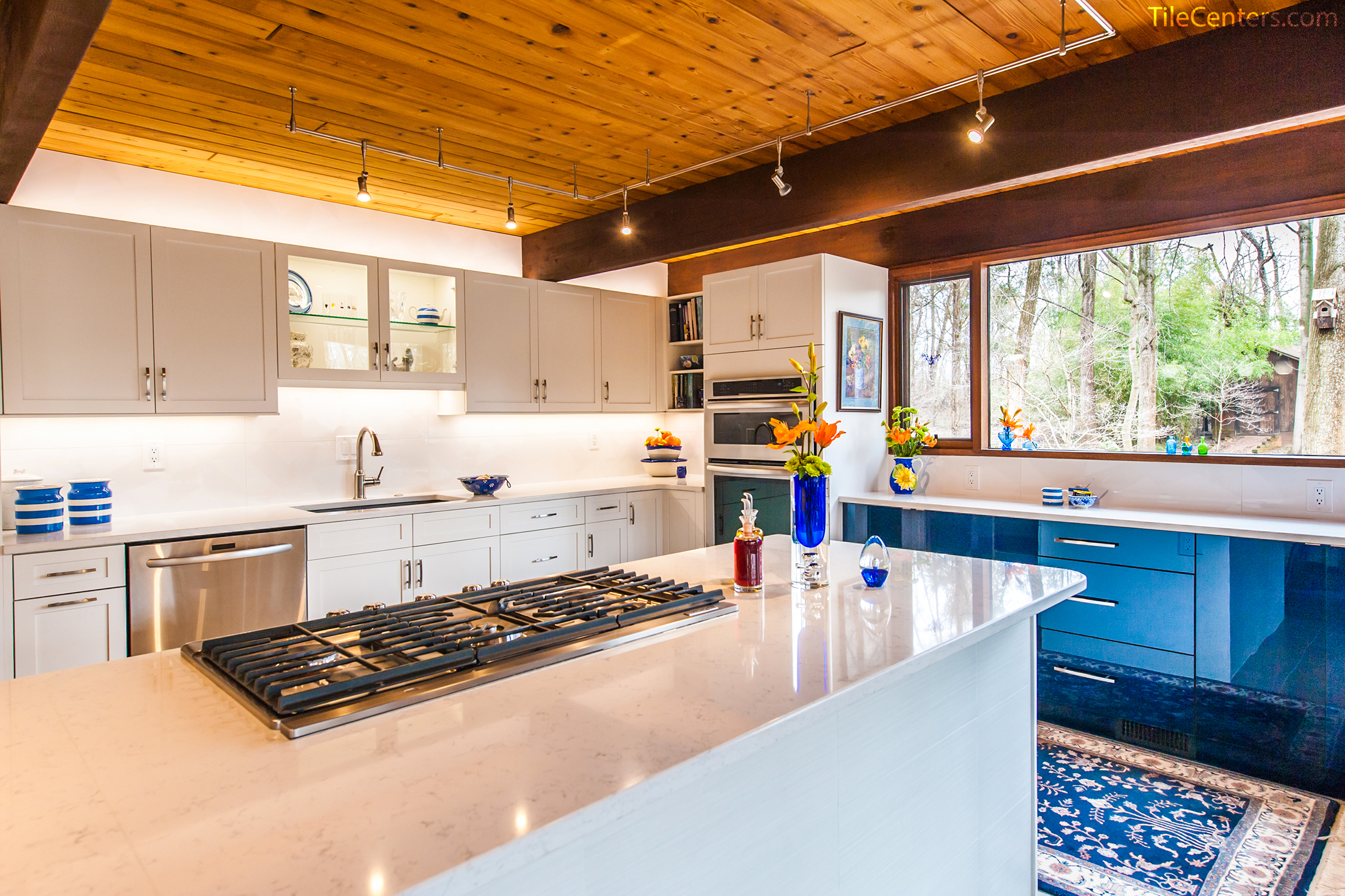 Check out this gorgeous modern kitchen remodel by Tile Center with a unique blue accent twist throughout. It features: