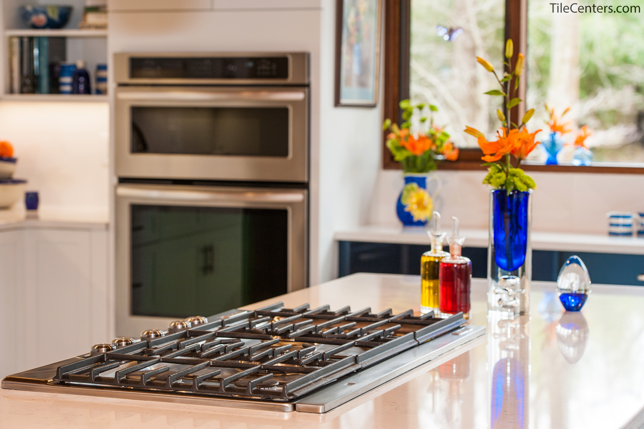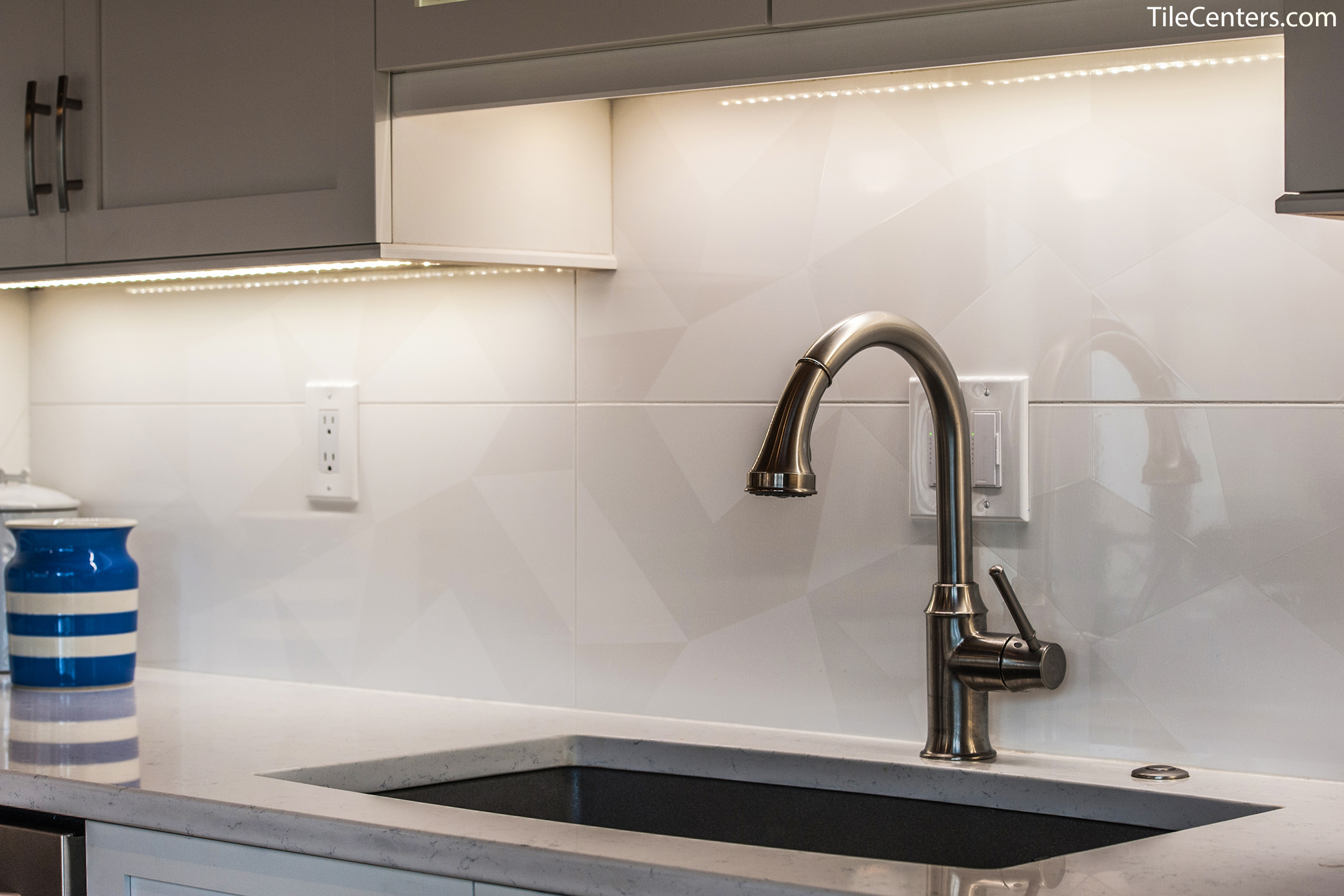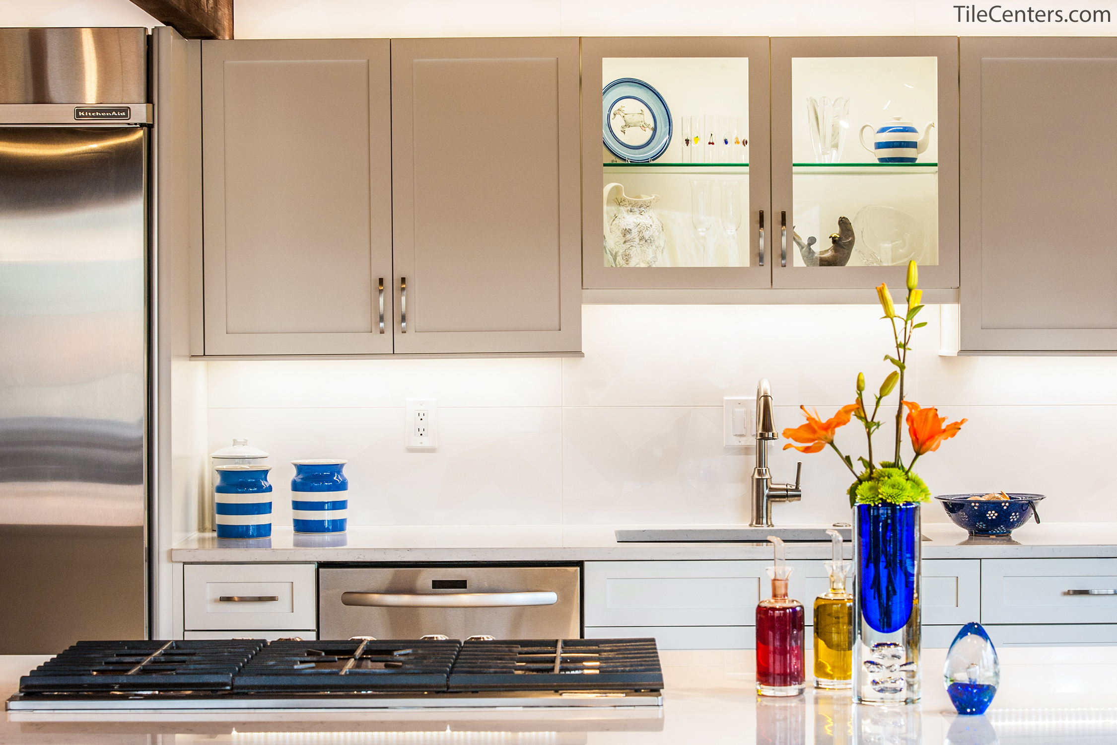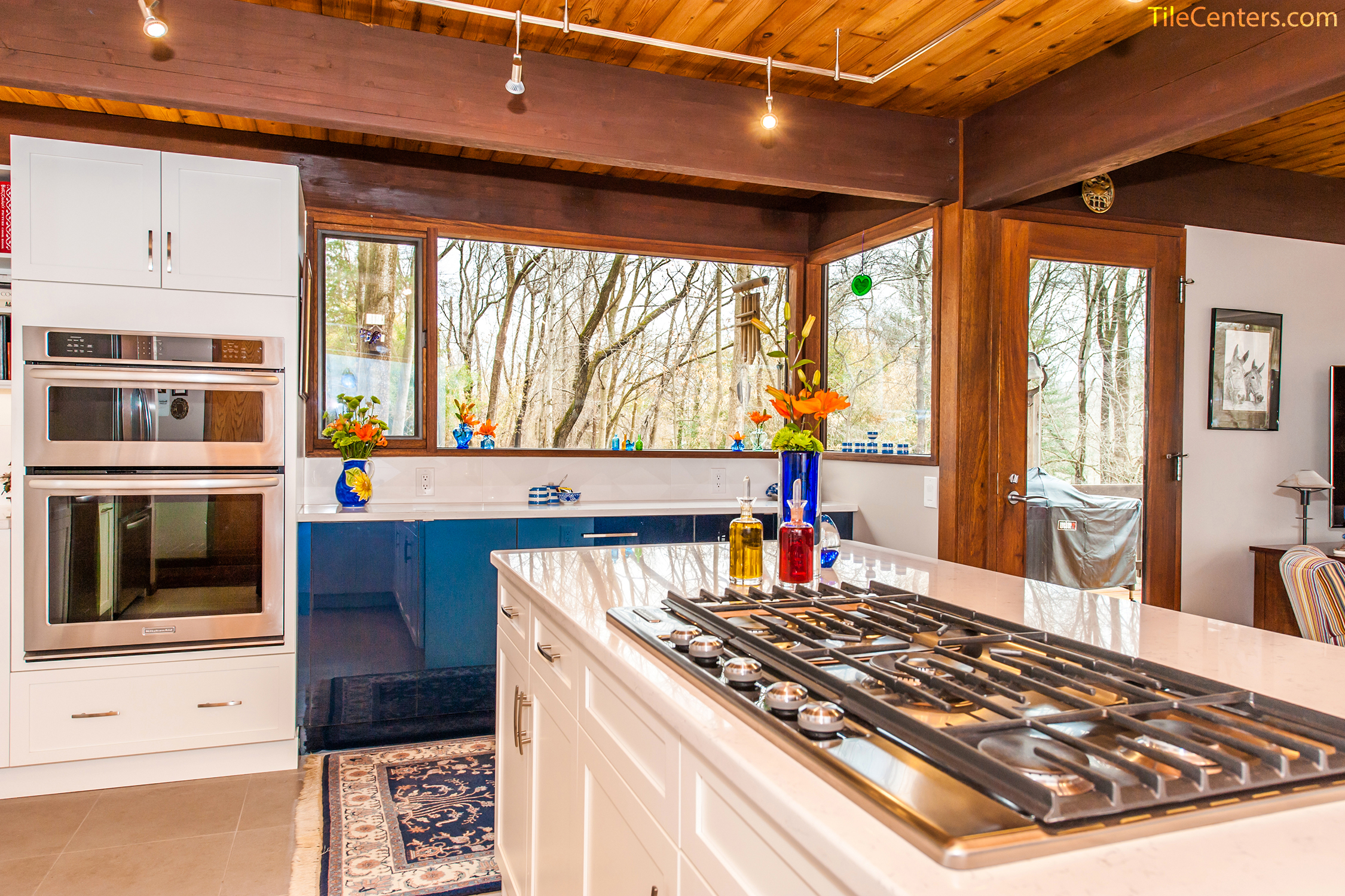 Check out this gorgeous modern kitchen remodel by Tile Center with a unique blue accent twist throughout. It features: